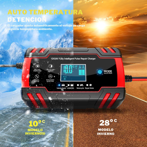 Pantalla digital inteligente: con detección inteligente, usando la pantalla automática de datos del carrusel, mostrará corriente/voltaje/temperatura/proceso de carga/estado de conexión inversa/estado de reparación/energía de la batería. También hay múltiples opciones de modo: automóvil, AGM / GEL, moto y reparación.